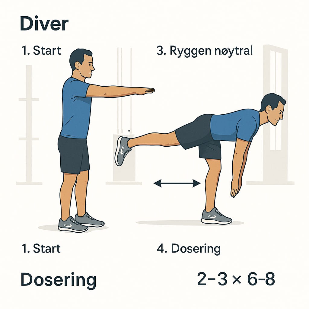 Dosering: 2–3 sett × 8–10, daglig eller annenhver dag.