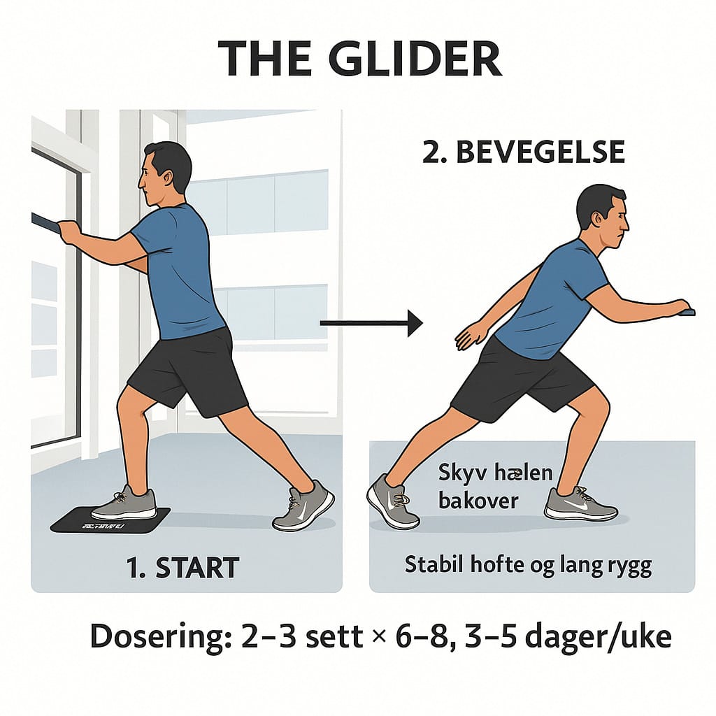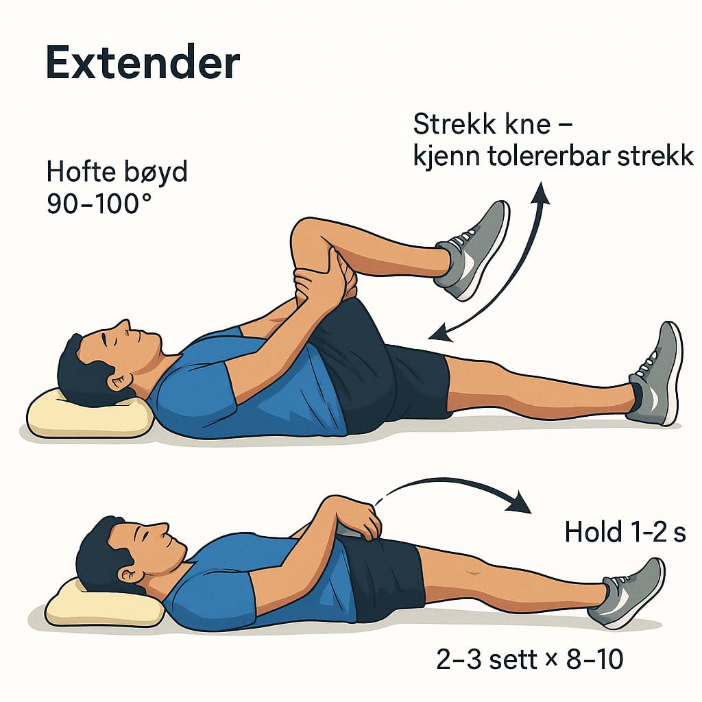 Nøkkelen: Tren med stort bevegelsesutslag og øk gradvis. Prioritér både styrke og utholdenhet for stabil framgang. Riktig progresjon og presist doserte øvelser kan gi en betydelig raskere vei tilbake til normal funksjon. Bruk bevegelsesvariasjon – gjerne flere lignende øvelser i samme serie (*«repetisjon uten repetisjon»*) for å bygge robusthet.